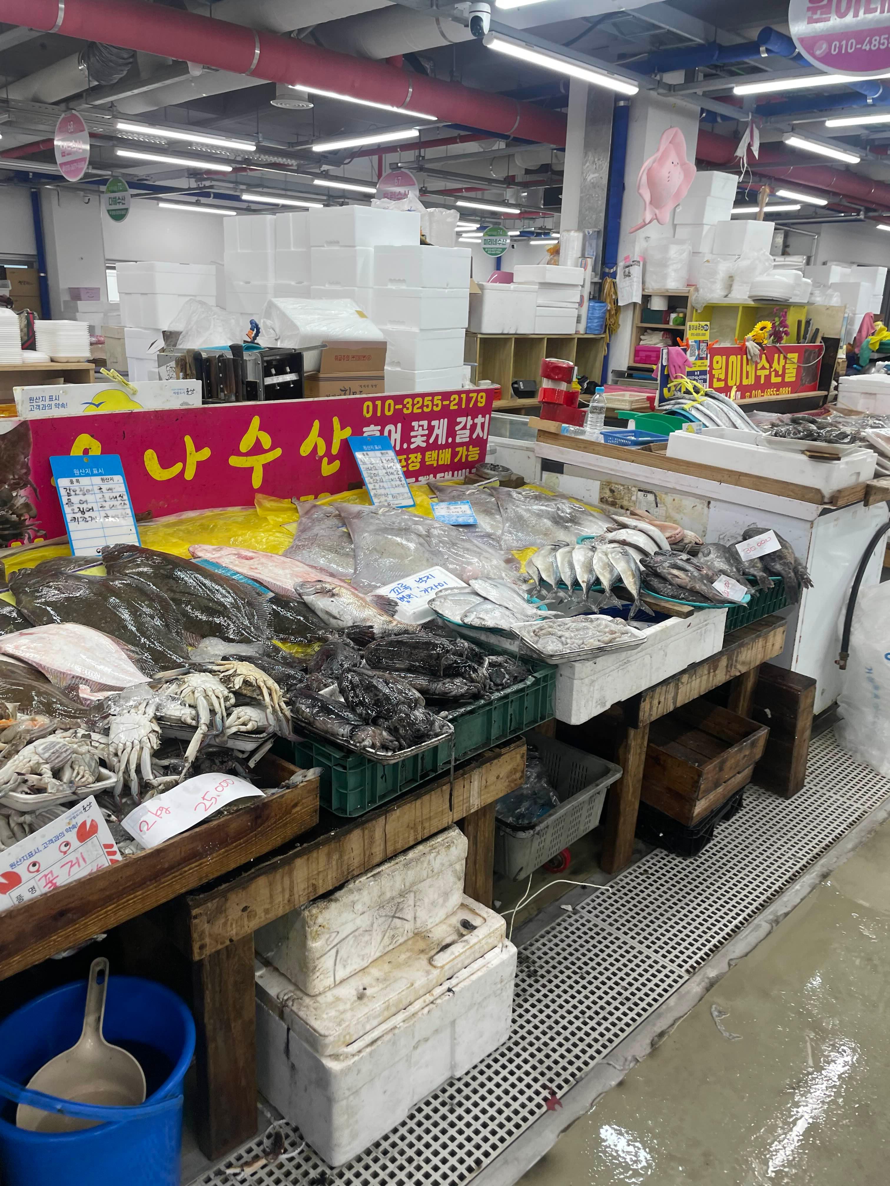 시장에 들어서자마자 수조마다 펄떡펄떡 뛰는 광어, 우럭, 낙지들이 반겨주더라고요. 그날 잡은 싱싱한 활어들, 조개, 새우, 홍어...
