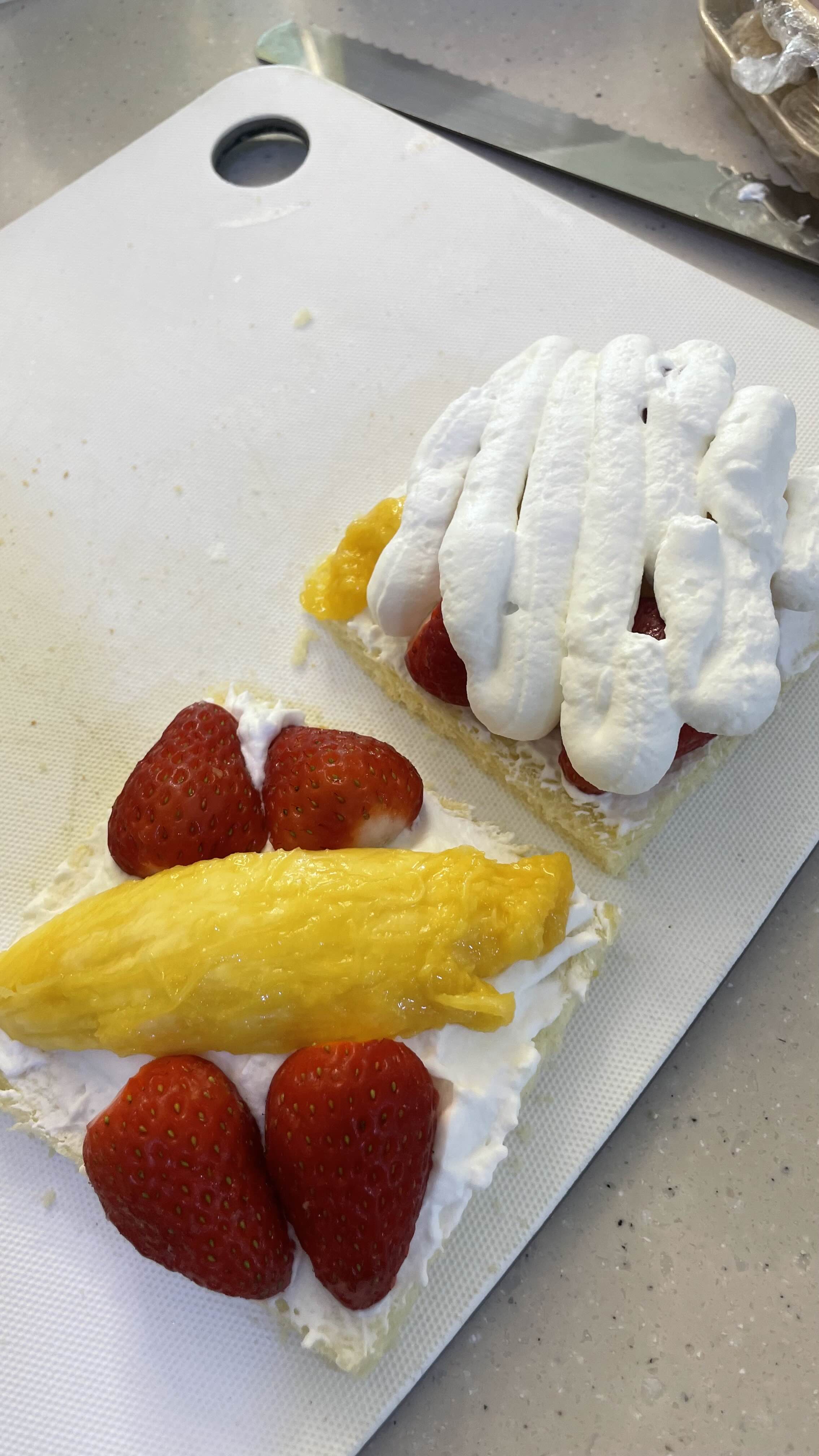 식빵 위에 생크림을 바르고, 그 위에 딸기와 망고를 올립니다.